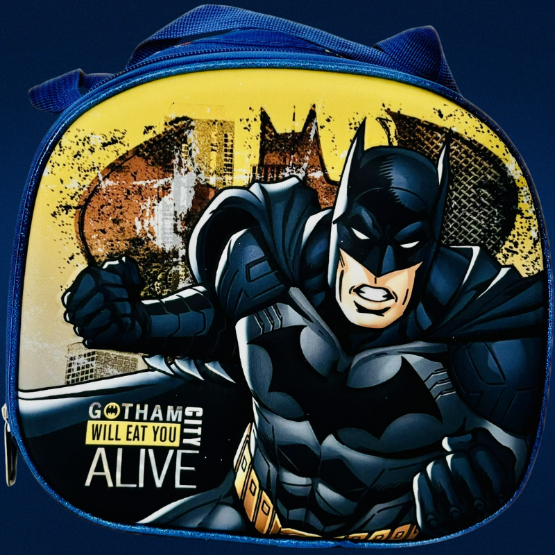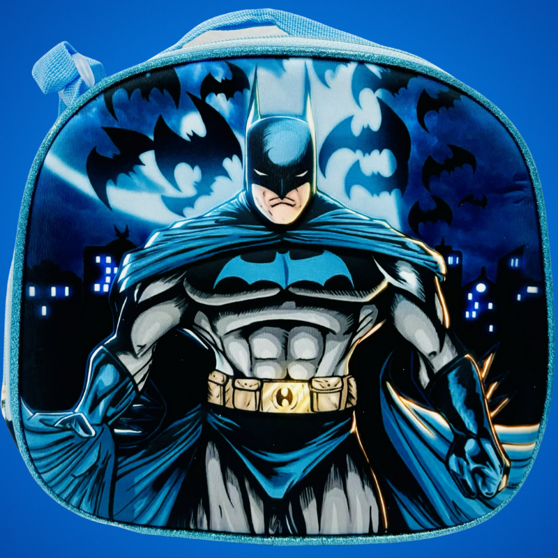 El set incluye una mochila principal con gráficos de Batman, una bolsa térmica para el almuerzo también decorada con el logo de Batman, y una bolsa pequeña para lápices o accesorios.
