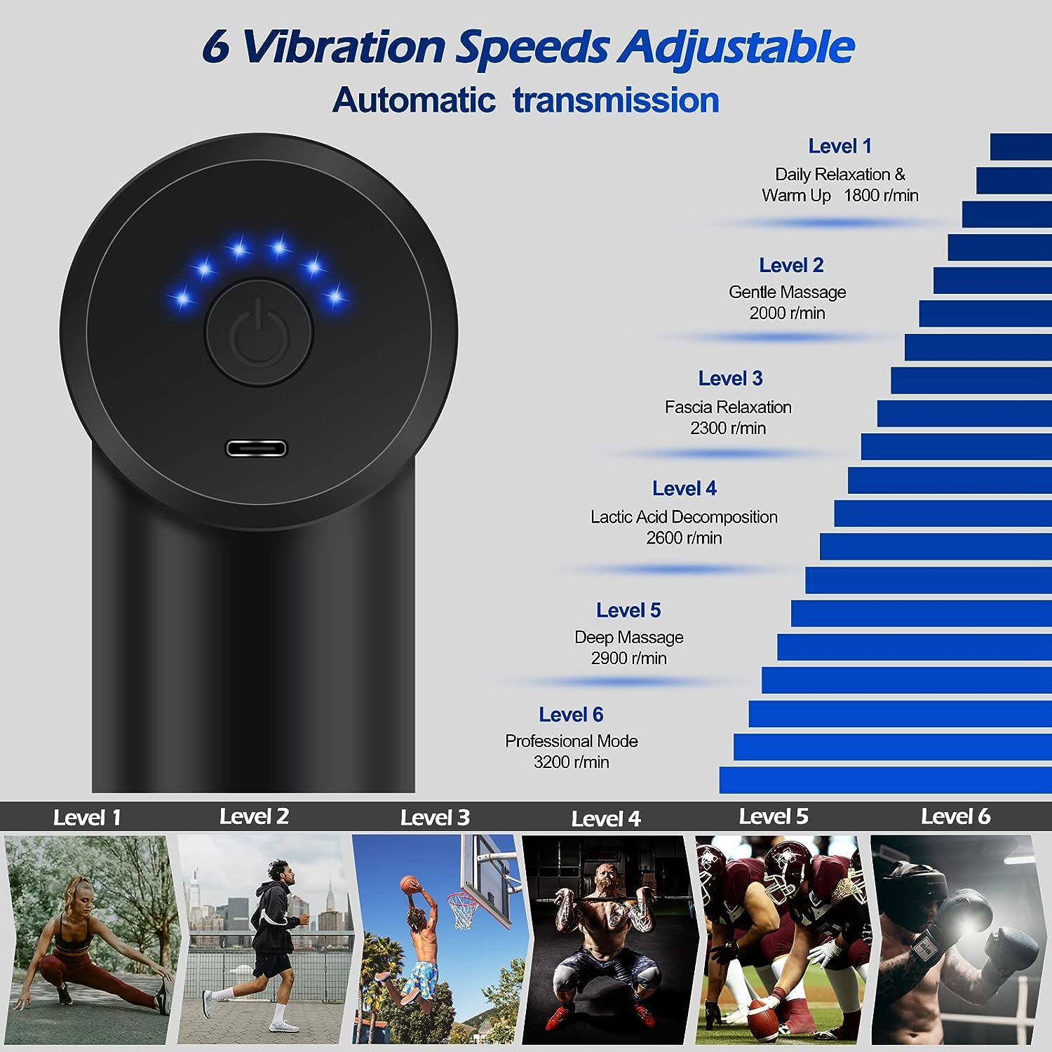 - 💪🏻【Portátil y Seguro de Usar】Mini pistola de masaje pesa solo 550g, se puede sostener fácilmente con una mano y viene con una caja de almacenamiento exquisita. La amplitud de vibración de 6 mm permite que sus músculos estén profundamente relajados, El mini diseño te permite relajarte en cualquier momento y en cualquier lugar sin que te afecte el medio ambiente. Puedes llevarlo al gimnasio, oficina, exterior, etc.Recordatorio: no lo use durante la carga.